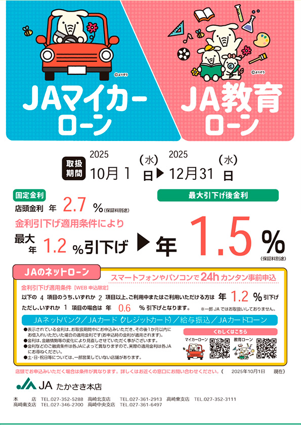 「JAマイカーローン・JA教育ローン」キャンペーン情報を掲載しました